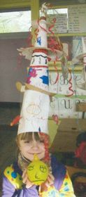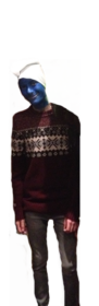Leo va disfrazado de un monstruo. Lleva un jersey largo que le llega hasta la cintura de color blanco y gris como las nubes yen el centro lleva una corbata muy vistosa de color verde . De cintura para abajo lleva un pantalón de color negro como la noche y en su cabeza luce un hermosa gorra de igual color que los pantalones y por ultimo no lleva zapatos. | |