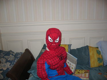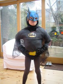 Eliott lleva una camiseta y unos pantalones grises, un calzoncillo de color negro y un cinturón amarillo. Tiene unas botas negras, una capa negra que llega desde los hombros hasta la cintura y una mascara de color negro. En el pecho lleva dibujado un murciélago. | ELIOTT esta disfrazado de BATMAN |