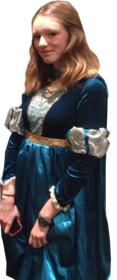 Julie lleva un vestido azul largo con un cinturón dorado y la parte de arriba de azul más claro. Tiene unos brazaletes de color azul claro con rayas azules oscuras y blanco en las mangas. | JULIE esta disfrazada de PRINCESA |
