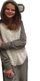 Justine viste un traje de pelo gris por todo el cuerpo. En la parte delantera lleva blanco simulando la barriga. Sobre la cabeza tiene dos orejas grises y blancas. Le encanta comer zanahorias. | JUSTINE esta disfrazada de CONEJO |