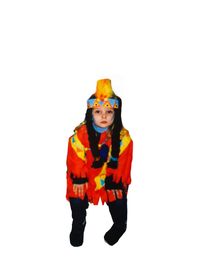 MANON lleva un disfraz de indio con una chaqueta roja con una ralla amarilla en las mangas con decoración y luce unos bonitos flecos rojos en la chaqueta y en las mangas. Lleva un pantalón negro Tiene una peluca con dos grande trenzas y un frontal azul decorado con objetos rojos y amarillos y lleva una pluma roja y amarilla. | |