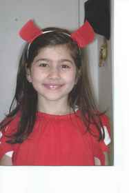 Maryline tiene unos cuernos rojos, el pelo largo y la camisa de igual color. Sus ojos son hermosos y luce una bonita sonrisa. | |