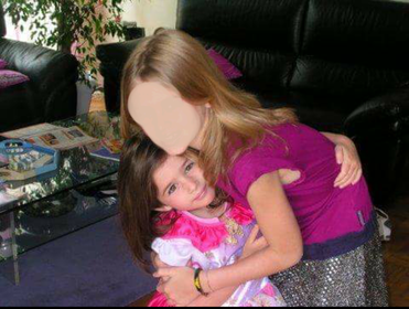 Shana lleva un vestido rosa y blanco de manga corta.Esta abrazada de una amiga que viste una camiseta morada de manga corta y un pantalon plateado y negro.Las dos tienen el pelo largo pero una rubio y la otra moreno. | |