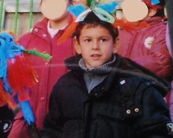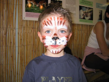 Alexandre luce una bonita máscara pintada en su cara. Su frente la lleva pintada con una raya blanca horizontal y encima de las cejas también tiene pintados unos pelitos al igual que en su barbilla, y por último la nariz la lleva pintada de negro. |
