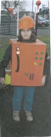 Matthias lleva pantalones azules, una caja de cartón naranja, verde y amarilla con botones, en la cabeza lleva un casco con antenas y lleva zapatos de deporte. No es un ser humano, es un .... | MATTHIAS disfrazado de Robot |
