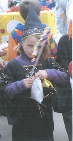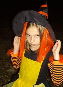 Jeanne, es una chica que lleva un gorro puntiagudo negro con rayas naranjas. Debajo tiene una peluca naranja. Viste un vestido negro con un delantal amarillo y las mangas son de rayas naranjas y negras. | Jeanne disfrazada de Bruja |