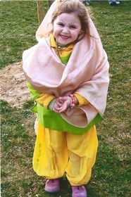 Maelle, viste un velo blanco que le cubre la cabeza y los hombros. Viste un mono amarillo hasta los pies y por la cintura una tela de color verde. Los zapatos son rosas. | Maelle disfrazada de India |