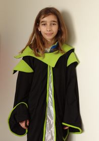 Claire, es una chica que lleva puesto un vestido con colores negro, verde y blanco. Es un vestido negro largo con hombreras verdes y el cuello tiene el mismo color. En el bosque los puedes ver con sus orejas puntiagudas pensando en algunas maldades. | Claire disfrazada de Elfa |