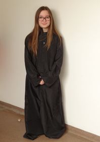 Enza, es una chica que tiene unas gafas negras. Viste un hábito negro, largo y en el convento reza mucho. | Enza disfrazada de Monja |