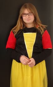 Flavie, es una chica que viste un vestido de color negro hasta la cintura. Las mangas son de color rojo y negro. En el pecho lleva un triangulo amarillo. La falda es amarilla. | Flavie disfrazada de Blancanieves |