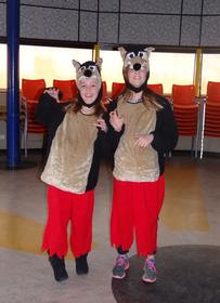 Isaline y Alicia, son dos chicas que llevan un gorro marrón con orejas, ojos y naríz para oírte, verte y olerte mejor. Visten una camiseta marrón clara y las mangas son de color marrón oscuro. Tienen unos pantalones rojos. Visten zapatillas oscuras. En el bosque asustan hasta a caperucita. | Isaline y Alicia disfrazadas de lobos |