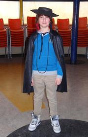 Josselin, lleva un sombrero negro y una capa también negra. Viste un jersey azul con pantalones plateados y unas zapatillas. Sabe hacer muy bien las "Z" | Josselin disfrazado de El Zorro |
