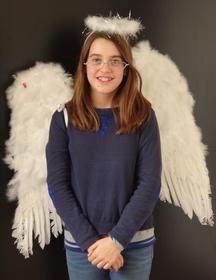 Léa, es una chica disfrazada con un aro en la cabeza blanco. Lleva además unas alas blancas y grandes. | Léa disfrazada de Angel |