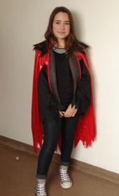 Malou, es una chica que viste con una capa roja con camiseta y pantalón negro. Tiene unas zapatillas negras y blancas. En el infierno ayudan al diablo a hacer maldades. | Malou disfrazada de Diablesa |