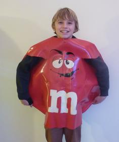 Max, Es un chico vestido de caramelo rojo. Tiene ojos, boca y cejas en la parte de la barriga.Tiene ademas una letra "m" en color blanco.Viste los brazos con una camiseta marron y tiene unos pantalones de mismo color. | Max disfrazado de bombón M&M'S |
