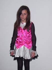 Mélodie, tiene un vestido de color blanco y negro. Las mangas son negras y la falda es blanca y corta.Viste un chaleco rosa y las medias son negras. | Mélodie disfrazada de bailarina |