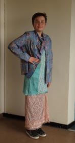Nathan, es un chico que viste una chaqueta de color azul con flores. Debajo tiene una camisa de color azul claro y con lunares en la barriga. Tiene además una falda de color rosa con rayas marrones. Por último viste unos zapato negros con suela blanca. | Nathan disfrazado de abuela |