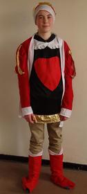 Gauthier, es un chico que lleva en la cabeza una corona de color blanco y rojo. Viste una camiseta de color negro y el centro tiene un corazon de color rojo.El cuello de la camiseta es redondeado y de color blanco.Tiene una chaqueta de color rojo con mangas lagas y el puño blanco.Los pantalones son marrones y las botas rojas con una cinta blanca por la parte superior. | Gauthier disfrazado de Príncipe enamorado |