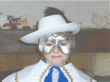 Erwan lleva una máscara de plata con bordes de oro, un sombrero blanco con una pluma negra, capa blanca con bordes dorados y debajo una camisa azul. Noble y serio en la mirada, es un..... | Erwan disfrazado de Mosquetero |