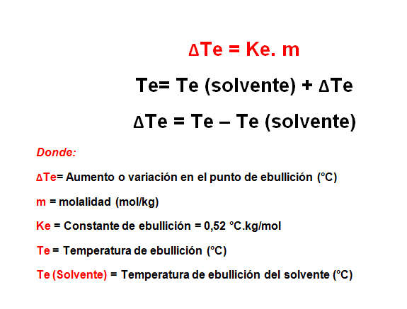 | -Aumento del punto de ebullición: El punto de ebullición es la temperatura en la cual la presión de vapor de un material líquido iguala a la presión atmosférica. | Otra manera de definirlo, es como la temperatura a la cual un material pasa del estado líquido al estado gaseoso. (agua con sal) |