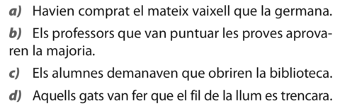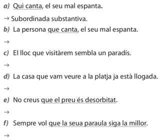 | Activitat 6 | Digues si les proposicions subratllades són subordinades adjectives o substantives. En el cas de les proposicions subordinades adjectives, subratlla’n l’antecedent |