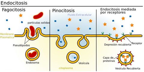 | Endocitosis: Es el proceso por el que la célula capta partículas de gran tamaño del medio externo mediante una invaginación de la membrana en la que se engloban las partículas a ingerir. Existen 3 procesos: Fagocitosis, pinocitosis y endocitosis por receptores como se muestra en la figura. | |