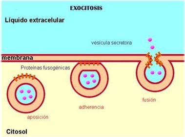 | Exocitosis. Es el mecanismo por el cual las macromoléculas contenidas en vesículas citoplasmáticas son transportadas desde el interior celular hasta la membrana plasmática, para ser vertidas al medio extracelular, de esta forma la célula elimina desechos metabólicos entre otras partículas. | |