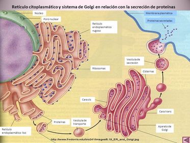 | Retículo endoplasmático: Conjunto de sacos membranosos comunicados entre si y presenta 2 variedades; el RUGOSO con ribosomas adheridos que transporta la proteínas sintetizada al aparato de Golgi y el LISO, que sintetiza lípidos para la membrana. Ambos participan en el procesos de detoxificación de la célula. | |