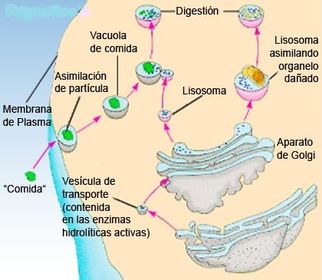 | Los lisosomas Son pequeñas vesículas que contienen en su interior poderosas enzimas digestivas cuya función es hacer digeribles los alimentos que llegan a la célula. Se forman en el R.E.P. rugoso se modifican en el aparato de Golgi el cual los libera al citoplamas. | |
