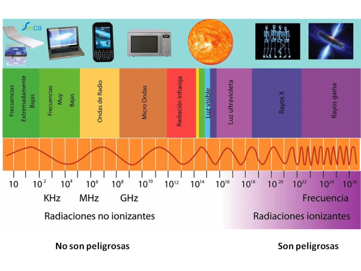 Radiaciones ionizantes.Corresponden a las radiaciones de mayor energía (menor longitud de onda) dentro del espectro electromagnético. Tienen energía suficiente como para arrancar electrones de los átomos con los que interaccionan, es decir, para producir ionizaciones. Radiaciones no ionizantes. Son aquellas que no poseen suficiente energía para arrancar un electrón del átomo, es decir, no son capaces de producir ionizaciones. |