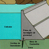 | Riesgo que Supone la Construcción de una Presa | Como en el caso de todas obras estructurales, existe el riesgo de que la presa falle e inunde poblaciones ubicadas cercanas al curso de agua, aguas abajo del cierre. La ingeniería civil se encarga de reducir al mínimo la posibilidad de la rotura del dique mediante un análisis exhaustivo del comportamiento de la obra ante situaciones extremas, calculando la estabilidad de la presa tomando en consideración sismos, lluvias torrenciales y otras catástrofes. |