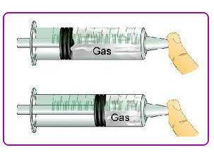 | Compresión La compresión es la disminución del volumen de un gas porque sus moléculas se acercan entre si, debido a la presión aplicada. Por ejemplo: Se puede observar cuando presionas el émbolo de una jeringa mientras tienes tapada su salida. | |
