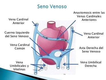 | 2. FORMACIÓN DEL SENO VENOSO El corazón empieza a latir el vigésimo segundo día y entorno al vigésimo cuarto día. La sangre comienza a circular por todo el embrión. El retorno venoso al principio ingresa en las astas sinusales izquierda y derecha a través de las venas cardinales comunes. El crecimiento diferencial del seno venoso derecho también empuja al vestigio del asta sinusal izquierda hacia la derecha. | Durante la 5ta semana, un proceso de invaginación incorpora el tronco y las dos primeras ramificaciones del sistema venoso pulmonar a la pared posterior del lado izquierdo de la aurícula primitiva. |