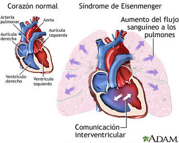 | SÍNDROME DE EISENMENGER | Se refiere a una combinación de hipertensión pulmonar y una comunicación interauricular, interventricular o un ductus. |