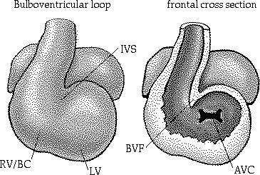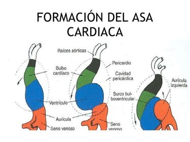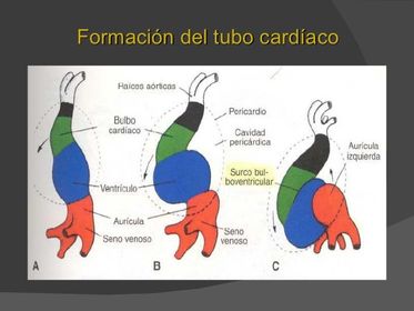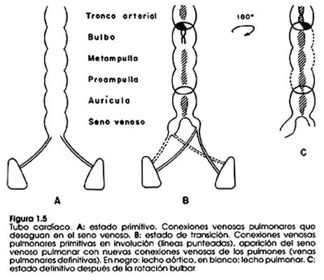 | 2- En las dos semanas siguientes aparecen todas las estructuras septales, que forman un sistema discontinuo, de manera que el corazón durante esta fase es un órgano parcialmente tabicado. La septación se completa en la última semana y media del desarrollo. | 3- La reorganización que experimenta el tubo cardíaco consiste básicamente en tres procesos, que tienen lugar en el extremo venoso, en el arterial y en el segmento ampular. Estos procesos se realizan después que el tubo cardíaco ha adoptado la forma de un asa dispuesta en el plano frontal. |