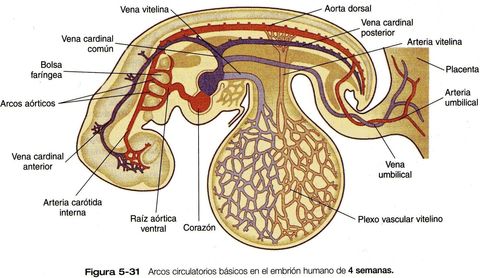 | 20-Este plegamiento, que se puede deber a los cambios de la morfología celular, forma el asa cardíaca y se completa a los 28 días. | 21- El corazón empieza a latir el vigésimo segundo día y entorno al vigésimo cuarto día, la sangre comienza a circular por todo el embrión. |