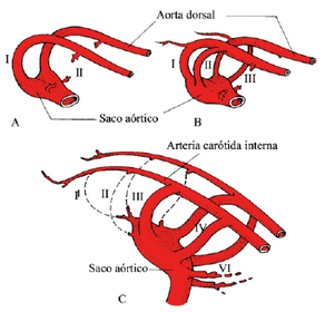 | 18- El saco aórtico se continua con el primer arco aórtico y finalmente, con los otros cuatro arcos aórticos. Los arcos aórticos forman arterias principales que irrigan la cabeza y el tronco. | 19- Ya el día 23 comienza a doblarse. La porción cefálica del tubo se pliega en dirección ventral y caudal y hacia la derecha, mientras que la porción auricular (caudal) lo hace en dirección dorso craneal y a la izquierda. |