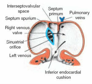 | 26- Mientras ocurre esto, dos membranas tisulares, las válvulas venosas izquierda y derecha, se desarrollan a cada lado de los tres orificios por encima de los orificios seno auricular, las válvulas izquierda y derecha se unen para formar un tabique transitorio denominado septum spurium. | 27-. La válvula izquierda al final entra a formar parte de los tabiques que contribuye a la separación de las aurículas definitivas. La válvula venosa derecha, por el contrario, permanece intacta y forma la válvula de la vena cava inferior y la válvula del seno coronario. |