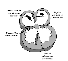 | 34-En el vigésimo octavo día, este surco que va profundizándose produce un borde de tejido con forma de cresta denominado septum primum que comienza a extenderse en la aurícula desde la pared superoposterior. | 35- Durante la quinta semana el borde libre del septum primum crece en sentido caudal hacia el canal auriculoventricular, separando progresivamente las incipientes aurículas derecha e izquierda. |