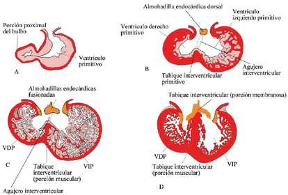 | 40- Una vez que los canales auriculoventriculares, los ventrículos y los tractos de salida cardíacos están alineados correctamente, todo está preparado para que se desarrollen las siguientes fases de la morfogénesis cardiaca: la tabicación ventricular, la división de los tractos de salida en aorta ascendente y tronco de la pulmonar y el desarrollo de las válvulas cardíacas. | 41- A finales de la cuarta semana, la parte inferior del surco bulbo ventricular comienza a protuir en la luz cardiaca, en la interfase entre las cavidades ventriculares derecha e izquierda. Este tabique parece formarse al acercarse más estrechamente las paredes en crecimiento de las dos cavidades ventriculares. |