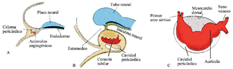 | FORMACIÓN Y POSICIÓN DEL TUBO CARDÍACO su formacion:en un principio, el tubo permanece unido al lado dorsal de la cavidad pericárdica. Luego desaparece el mesocardio dorsal y se crea un seno pericárdico transverso que conecta ambos lados de la cavidad pericárdica. su posicion consta de tres capas: a) endocardio, que forma el revestimiento endotelial interno del corazón; b) miocardio, que constituye la pared muscular; c) epicardio o pericardio visceral que cubre el exterior del tubo. | |