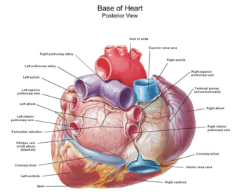 | Al principio el retorno venoso ingresa en las astas sinusales izquierda y derecha a través de las venas cardinales comunes. Luego a medida que aumenta seno venoso se incorpora progresivamente a la pared posterior de la aurícula en desarrollo Finalmente la aurícula primitiva se desplaza ventralmente y hacia la izquierda, donde se convertirá en la orejuela izquierda vestigial y se movera a través de los cuatro orificios de las cuatro venas pulmonares definitivas. | |