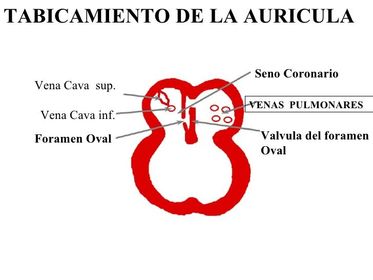 | TABICAMIENTO DE LA AURÍCULA Al principio tras la remodelación auricular, la raíz de la aurícula se deprime a lo largo de la línea media por el contorno suprayacentes. Luego este surco que va profundizándose produce un borde de tejido con forma de cresta denominado septum primum que comienza a extenderse en la aurícula desde la pared superoposterior. | Tras la fucion de las alhoadillas superior e inferior el borde en crecimiento del septum primum se fusiona con el septum ínter médium. Luego se da la llegada de la sangre desde el pulmon. |