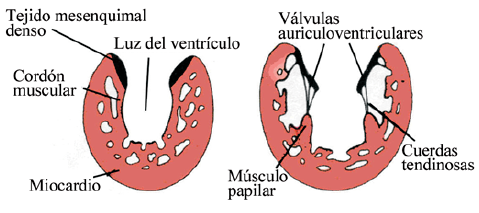 | Desarrollo de las válvulas cardíacas: Las válvulas auriculoventriculares comienzan a formarse entre la quinta y la octava semanas. Primero se forman las cúspides o valvas anterior y posterior a los lados de ambos canales. Estas valvas se encuentran firmemente arraigadas en el borde de los canales El borde libre de cada valva se fija a las paredes ventriculares anterior y posterior por finos tendones. cuando los ventrículos se contraen se cierran para evitar el flujo retrógrado. | |