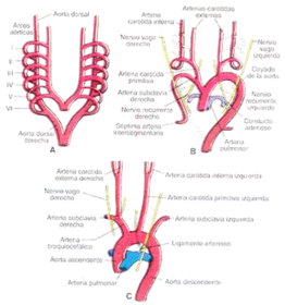 | El tronco arterioso finalmente se divide para formar la aorta ascendente y el tronco de la pulmonar y se conecta en su extremo superior a una dilatación | El saco aórtico se continua con el primer arco aórtico y finalmente, con los otros cuatro arcos aórticos. |