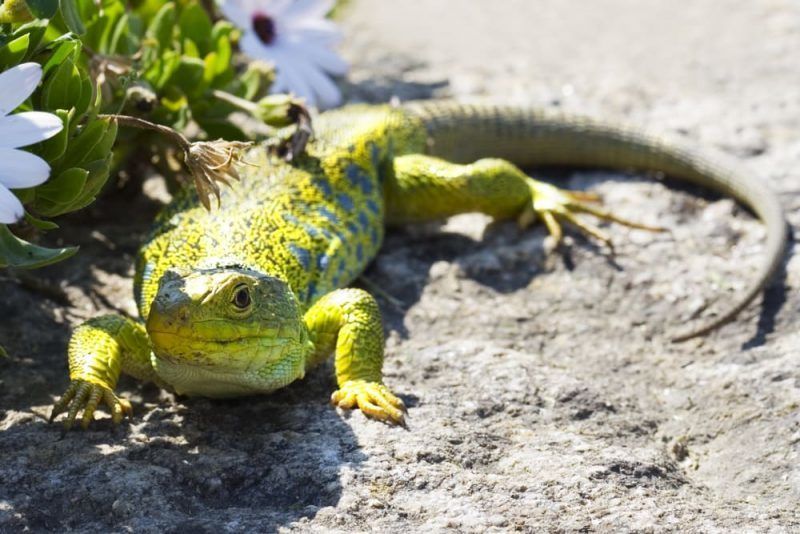 | Es frecuente ver a los reptiles, animales incapaces de regular su temperatura interior (animales de sangre fría), exponerse al sol para incrementar su temperatura corporal y energizar sus metabolismos. | |