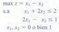 | b. Ejemplo 1 Se elige en forma arbitraria una variable que es fraccionaria en la solución óptima; si se elige x1 ¿entre qué valores debe estar x1 para la PE? | x1<=3 o x1>=4 |