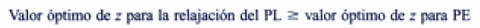 | Relajación del PL de la PE | PL obtenido cuando se omiten todos los enteros o las restricciones 0-1 en las variables |