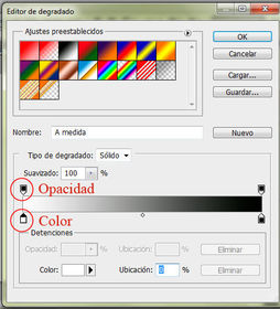 Degradado | Serie de etapas del color. Crea una fusión gradual entre los colores. Disminuye el tono del color establecido. https://helpx.adobe.com/es/photoshop/using/gradients.html\ |
