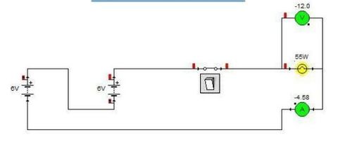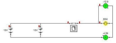 | 2. Conectar las baterías con el interruptor y la bombilla de tal manera que las baterías queden en paralelo. Cada batería suministra 50A. | a) ¿De cuanta tensión tendrá que ser la bombilla? ________ b) ¿Qué intensidad máxima pueden suministrar las baterías? _______ |